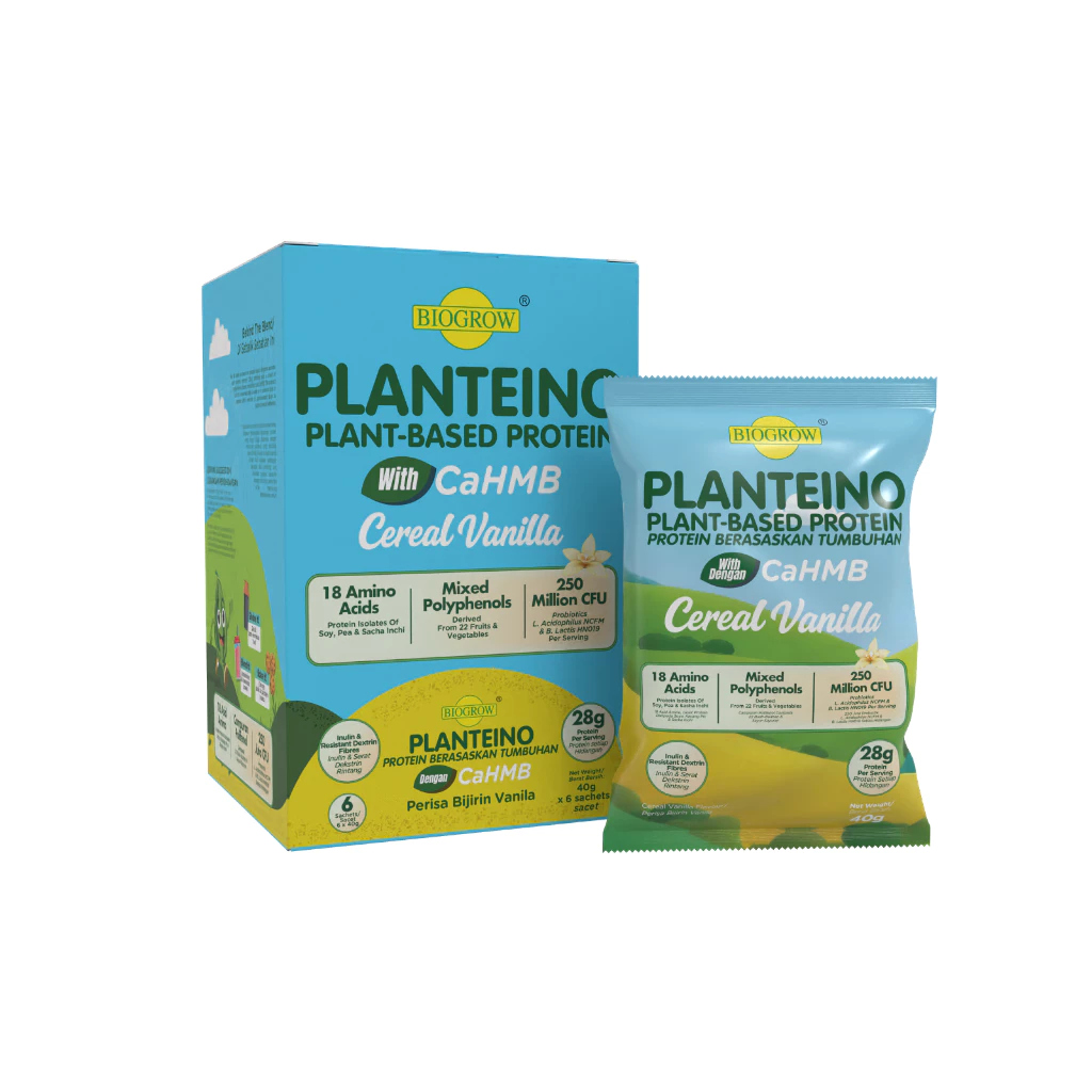 Tidak semua protein tumbuhan adalah sama. Biogrow Planteino menyediakan kandungan protein yang tinggi (28g), diperkaya dengan campuran polifenol, serat, probiotik dan CaHMB. Produk ini boleh diambil setiap hari sebagai sebahagian daripada diet seimbang, atau dinikmati selepas bersenam sebagai minuman pemulihan untuk menyokong kesejahteraan umum.